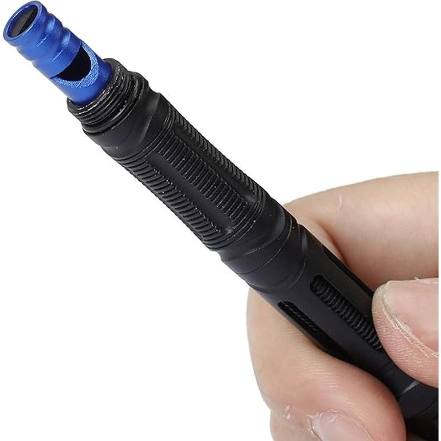 Stylish, black stone-washed aluminum pen-shaped multi-tool featuring a glass breaker, rope cutter, LED flashlight, fire starter, whistle, small knife, and two screwdriver bits. Perfect for EDC, camping, and survival.