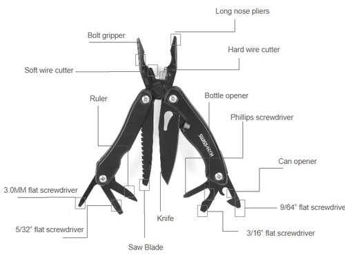 - 🛠️ 14 وظيفة في أداة واحدة - تشمل الكماشة، وقواطع الأسلاك، والمفكات، وأدوات القطع، والمزيد.